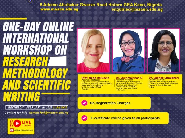 Maryam Abacha American University of Nigeria ONE-DAY ONLINE INTERNATIONAL WORKSHOP ON “RESEARCH: METHODOLOGY AND SCIENTIFIC WRITING” ON WEDNESDAY 09 FEBUARY 2025 AT 11:30 AM WAT …